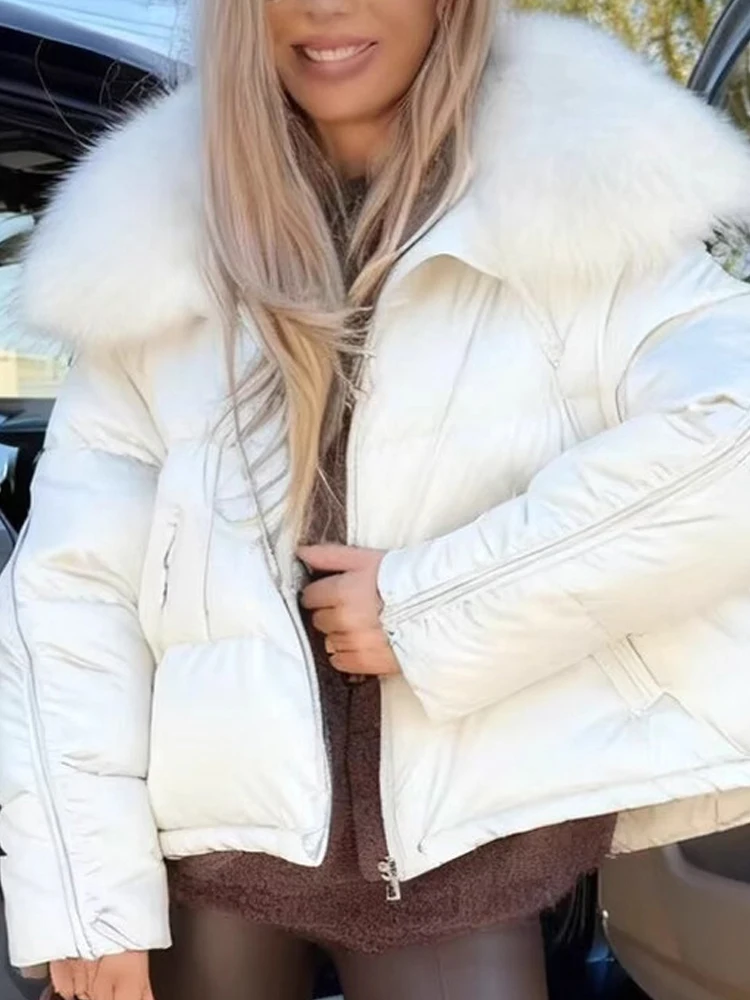 Осень-зима, элегантная теплая стеганая куртка, женская модная толстая молния, однотонное короткое пальто, повседневная верхняя одежда с меховым воротником и длинными рукавами и карманами