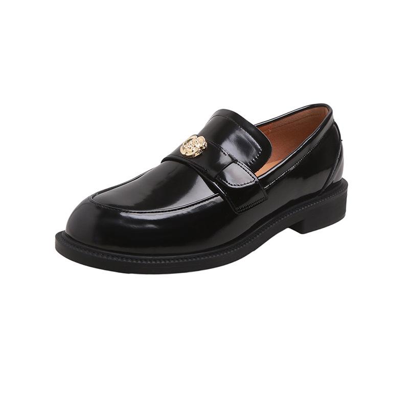Осень новая кожаная камелия золотая пряжка круглый носок одна педаль толстый каблук лоферы женский стиль маленькие кожаные туфли туфли 40