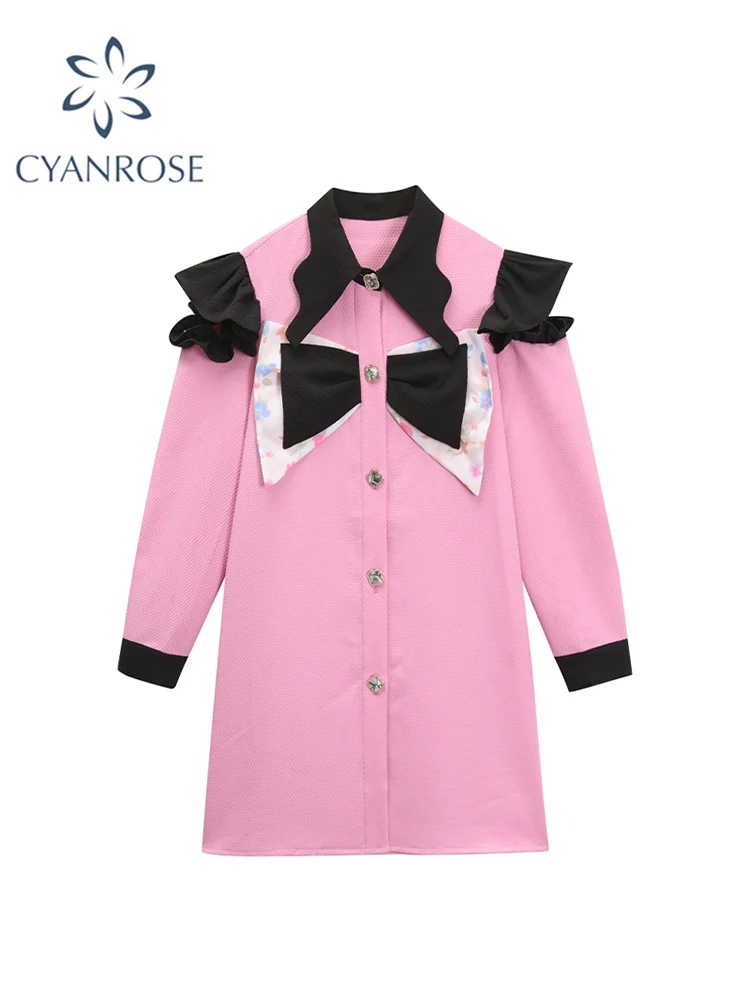 Осень 2022, элегантное женское розовое платье с бантом, ретро-платье с лацканами в пасторальном стиле, свежее приталенное платье-трапеция с дл...