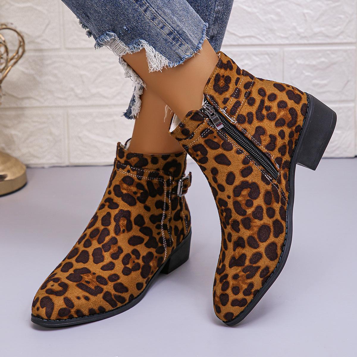 Остроносая осенняя пряжка ремня Короткие женские замшевые с леопардовым принтом Большого размера Винтажные Толстый каблук Челси 43 коричневый