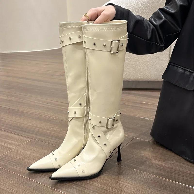 Остроносые женские сапоги до колена, модные узкие длинные сапоги с пряжкой на ремне, на тонком высоком каблуке, осенне-зимняя женская обувь 35