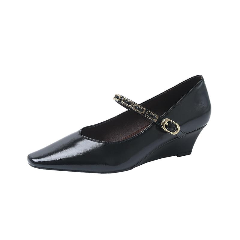 Остроносые туфли-лодочки женские новая мода высокий каблук ремешок с пряжкой на подъеме танкетка толстая подошва с мелким вырезом туфли из маленькой кожи женская обувь 40 чёрный