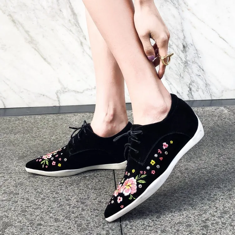 Flower Embroidered Lace-up WOMEN'S Flat Shoes Sheepskin Elevator Slanted Heel WOMEN'S Pumps Deep Mouth Spring And Autumn WOMEN'S