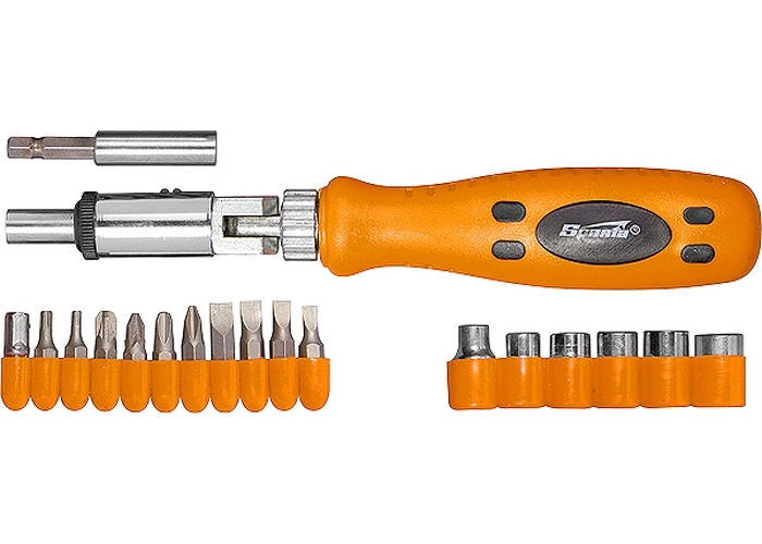 Отвертка с набором бит предназначена для монтажа и демонтажа резьбовых соединений. Реверсивный механизм отвертки позволяет заворачивать и отворачивать крепеж без перехватывания ручки. В комплект к отвертке входят биты с профилями SL, PH, Torx и торцевые головки – 5, 6, 7, 8, 9, 10 мм.