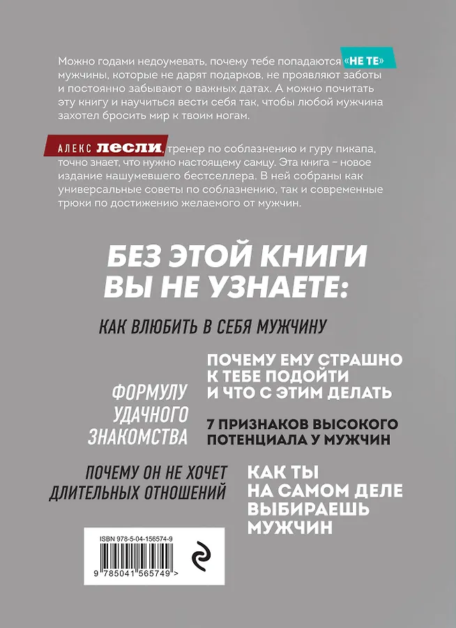 Можно годами недоумевать, почему тебе попадаются "не те" мужчины, которые не дарят подарков, не проявляют заботы и постоянно забывают о важных датах. А можно почитать эту книгу и научиться вести себя так, чтобы любой мужчина захотел бросить мир к твоим ногам. Алекс Ласли, тренер по соблазнению и гуру пикапа, точно знает, что нужно настоящему самцу. Эта книга – новое издание нашумевшего бестселлера. В ней собраны как универсальные советы по соблазнению, так и современные трюки по достижению желаемого от мужчин. Без этой книги вы не узнаете: Как влюбить в себя мужчину; Почему ему страшно к тебе подойти и что с этим делать? Формулу удачного знакомства 7 признаков высокого потенциала у мужчин; Почему он не хочет длительных отношений; Как ты на самом деле выбираешь мужчин.