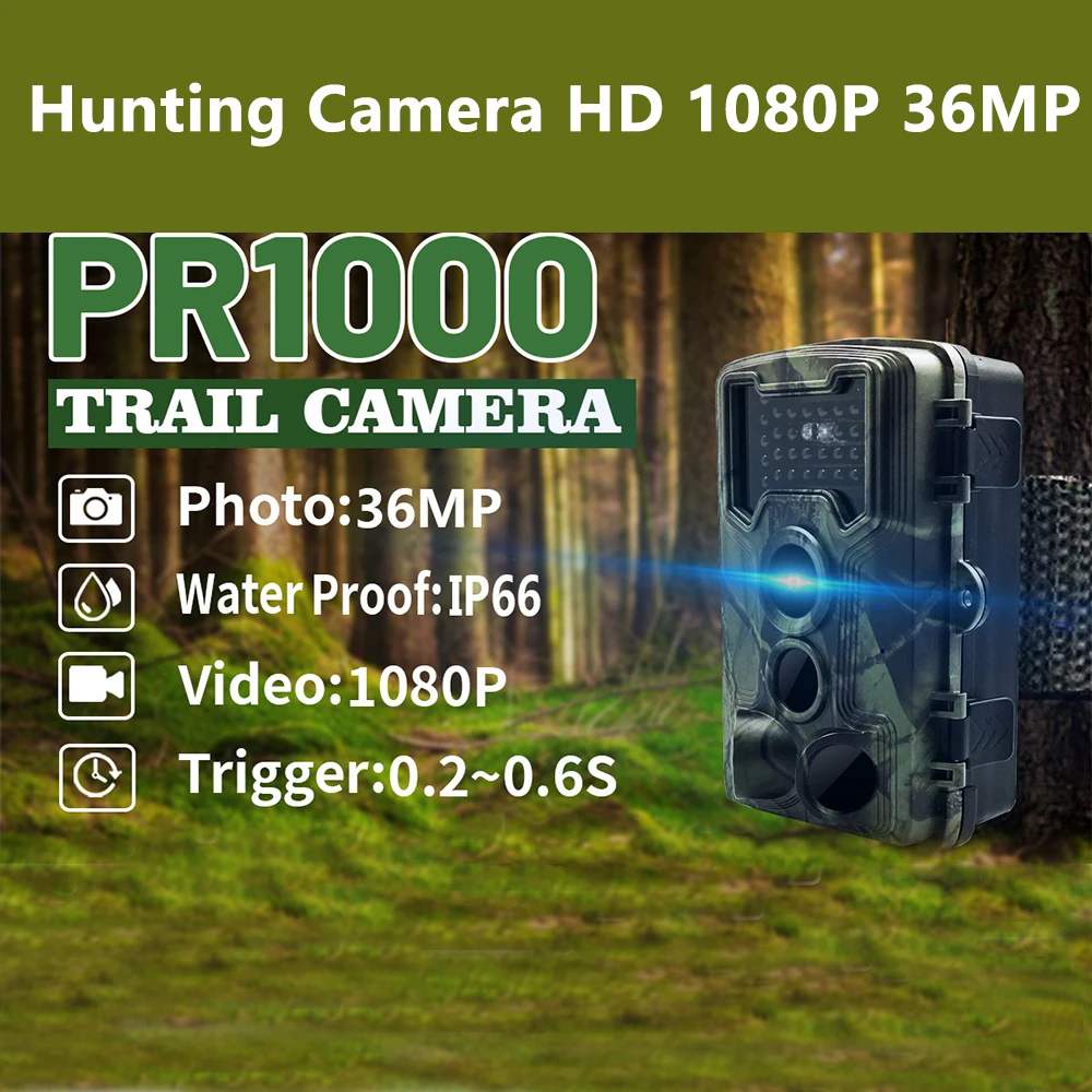 Охотничья фотоловушка PR1000, 36 МП, HD фотоловушка, диапазон обнаружения 120, IP66, Водонепроницаемая мини-камера 1080P для охоты на диких животных