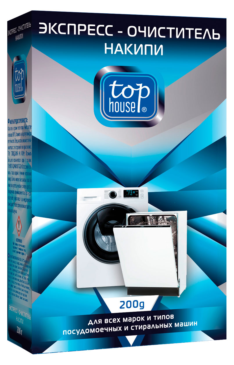 TOP HOUSE Экспресс-очиститель накипи для всех типов стиральных и посудомоечных машин, 200 г. Изготовлен по современной технологии и с учетом рекомендаций крупнейших производителей стиральных и посудомоечных машин. За одно применение полностью удаляет накипь с нагревательных элементов и внутренних деталей. Продлевает срок службы машин.