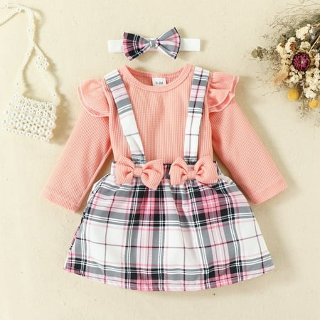 NIUREDLTD Baby Girls Cotton Plaid Autumn Bow Tie Long Sleeve Romper Bodysuit Suspender Dress Headbands Set Clothes
