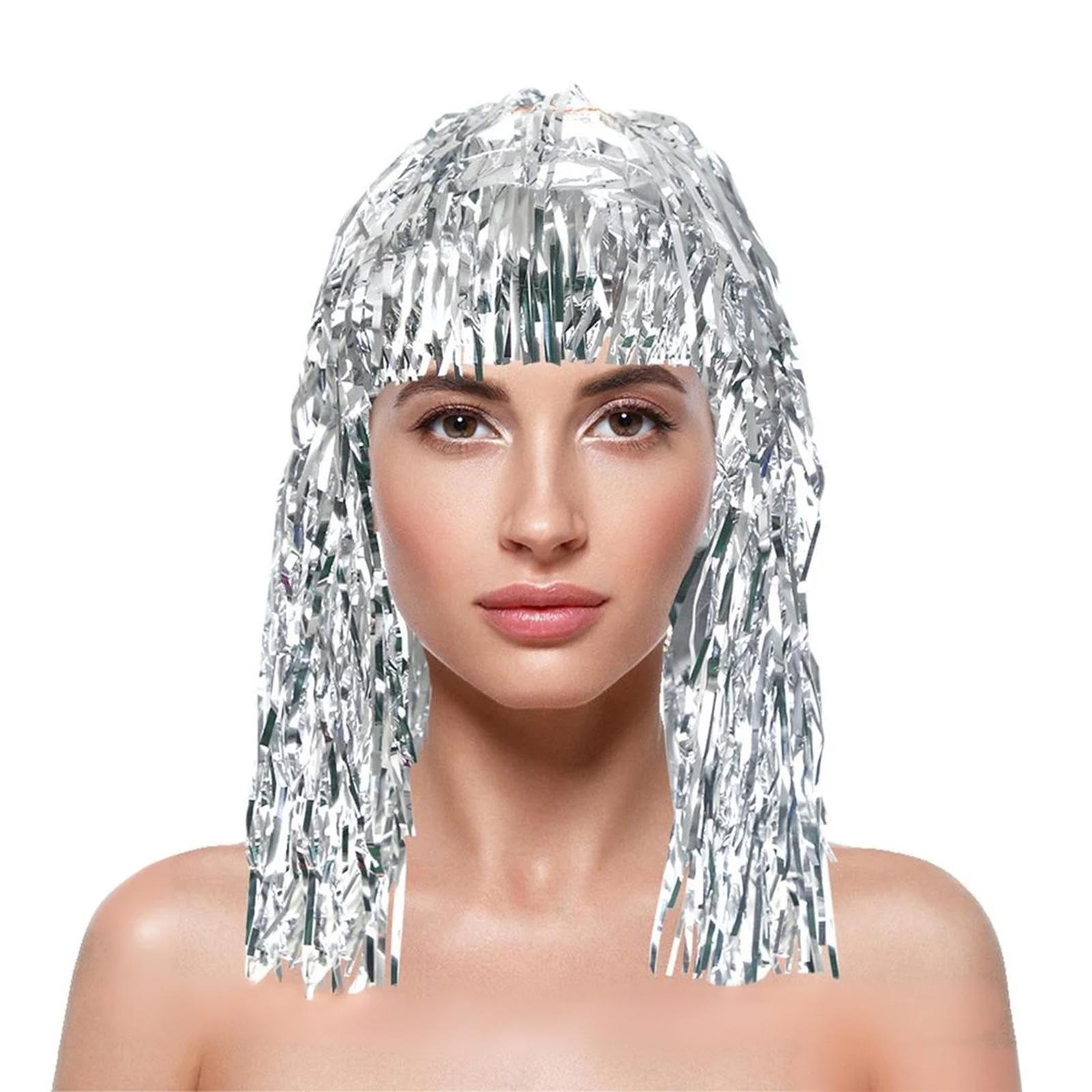 ПЭТ Дождевой шелк Шляпа Парик Фестиваль Вечеринка Танцевальная вечеринка Карнавальное украшение Яркий свет Кисточка Головной убор Чирлидинг Болельщики Красочный парик One Size серебряный