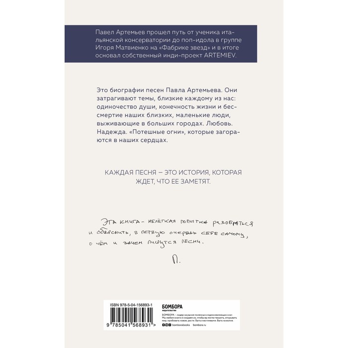 «Иногда кажется, что песня— это аномалия. Как что-то, настолько необязательное, вообще может существовать ивызывать привыкание, непонятно. Асдругой стороны, как представить свою жизнь без песни? Инайдетсяли тот, кто непоет?»Павел Артемьев прошел путь отученика итальянской консерватории допоп-идола вгруппе Игоря Матвиенко на«Фабрике звезд» ивитоге основал собственный инди-проект ARTEMIEV, чей репертуар совсем непохож наего карьеру вбойз-бенде. Это песни осемье, осмерти, олюдях идомах вокруг нас, оБоге, ободиночестве, надеждеи, конечно, олюбви. Они написаны наанглийском инарусском языках. Текст каждой песни всегда становится полным только всоавторстве, винтерпретации слушателей. Новсёже, если вам интересно, при каких обстоятельства сочинялись эти стихи ичто было насердце уавтора, что онхотел рассказать миру, тоэта книга поможет вам найти ответы. Каждая песня— это история, которая ждет, что еезаметят.
