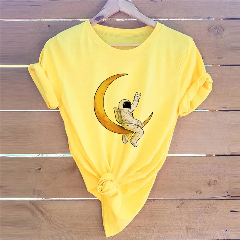 Plus Size Women Clothing S-5XL Moon Astronaut Print TShirt 100%Cotton Women Shirts O Neck Short Sleeve Tees Summer Loose Tops