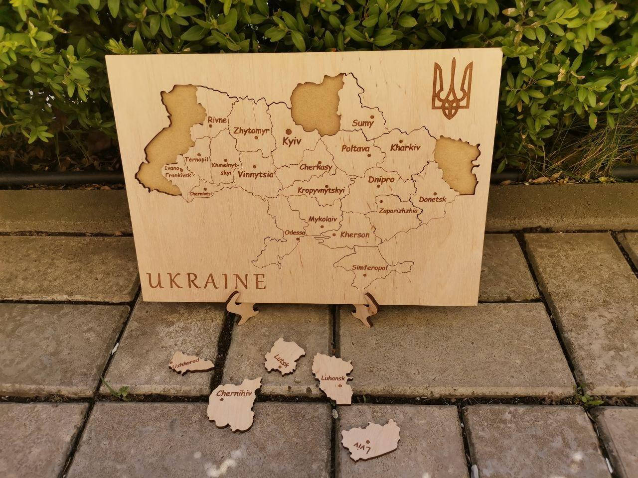 Пазл карта Украины с надписью "Ukraine" + герб на подставке