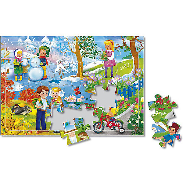 Пазл листовой на подложке «Времена года» ГеоДом познакомит малышей с временами года и свойственными для каждого из них явлениями. На картинке изображены ребята, которые занимаются разнообразными занятиями: гуляют в лесу, катаются на велосипеде, лепят снеговиков. В процессе сборки пазла у малышей развивается пространственное мышление, моторика рук, внимательность.