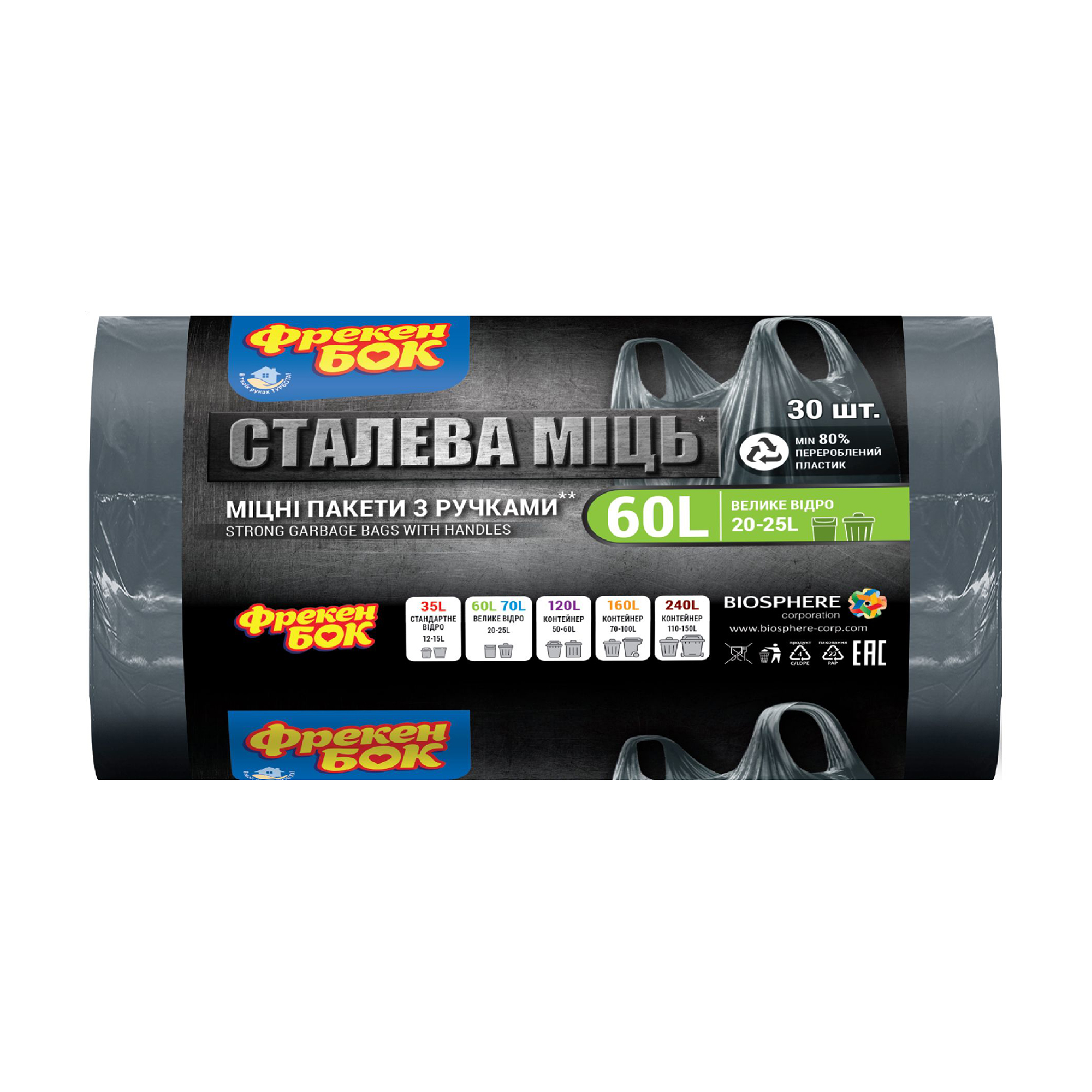 Пакети для смiття Фрекен Бок Сталева міць, з ручками, графіт, 60 л, 30 шт