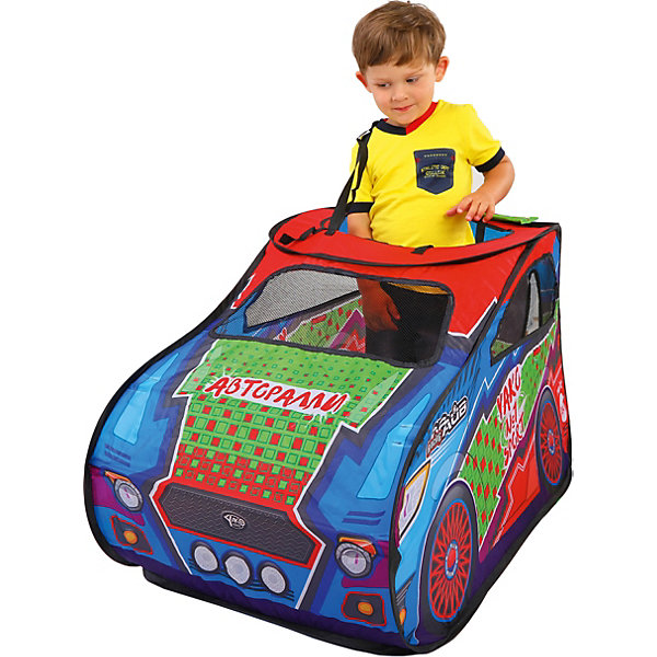 Красочная палатка выполнена в виде машинки для ралли. Вход расположен сзади. Предусмотрены три окошка из сетки и открытая крыша, на которой есть спойлер. Палатка хорошо пропускает воздух. На дне есть отверстия для ног. Также предусмотрены ремешки на плечи, чтобы палатку можно было надеть как костюм. Изделие компактно складывается в чехол с ручками.
