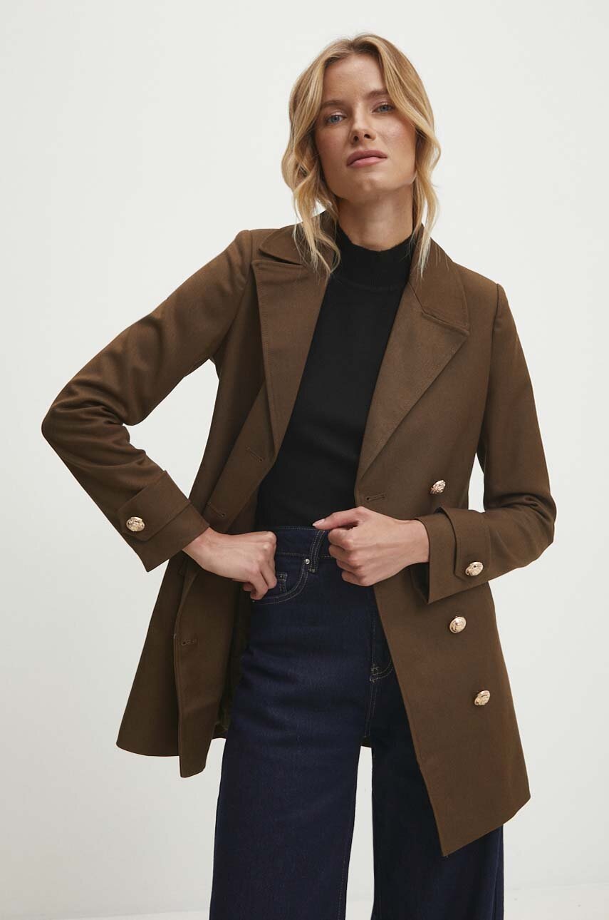 Палто Answear Lab. Моделът е без изолация, направен от изчистена материя. Благодарение на съдържанието на полиестер, материалът е по-устойчив на гънки.- Стандартна, неблокираща кройка.- Подплата.- Класически ревер.- Двойно закопчаване с копчета.- Подплънки на раменете.- Два странични джоба.- Дължина на ръкава: 62 cm.- Дължина: 80 cm.- Ширина под мишниците: 46 cm.- Ширина в раменете: 36 cm.- Мерките се отнасят за размер: S.