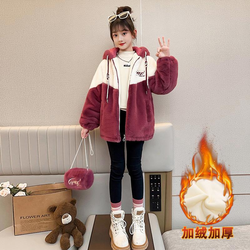 Пальто для девочек осень-зима 2024 новый плюшевый свитер детский зимний для девочек старшего возраста утолщенная плюшевая зимняя одежда 120cm бордовый