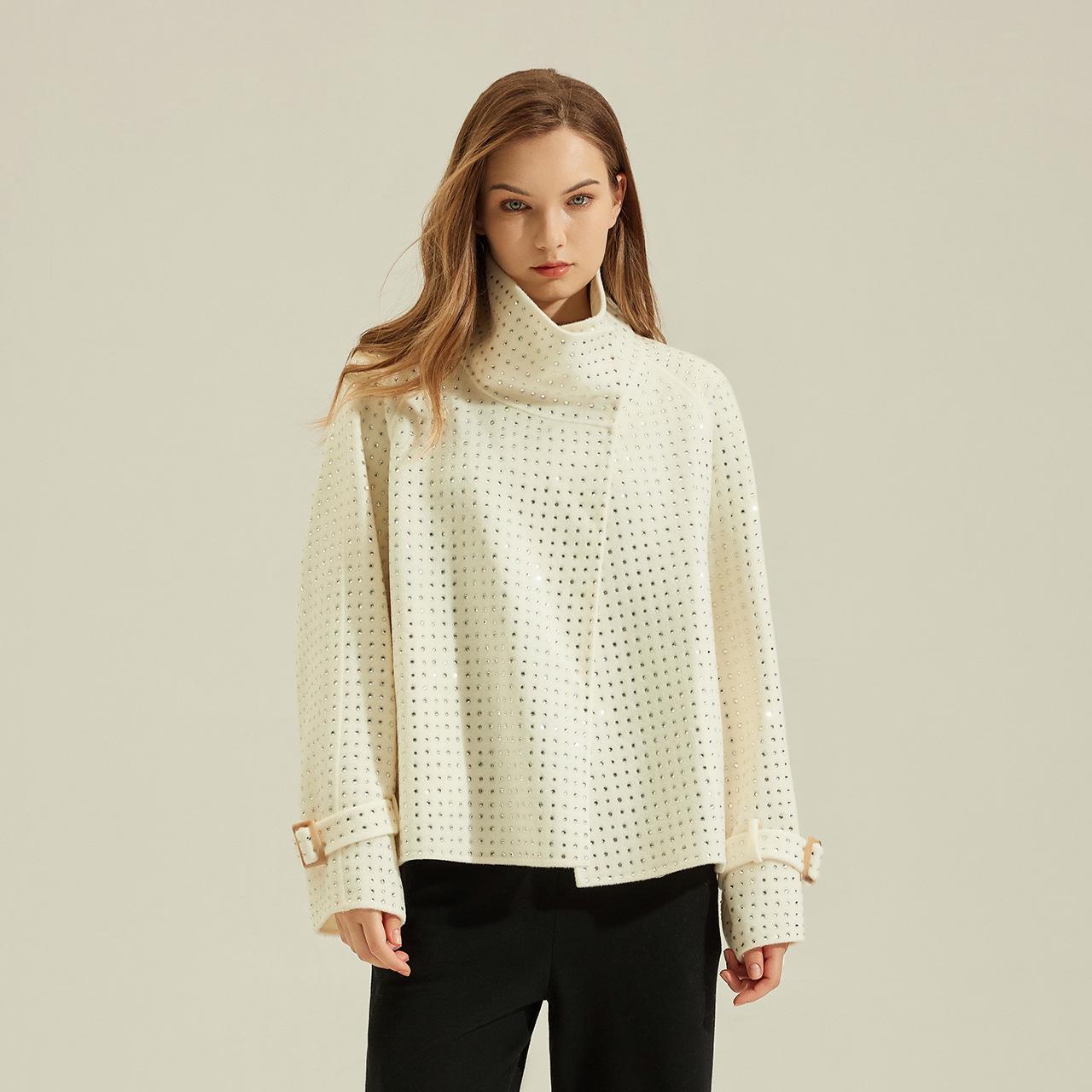 Пальто из двусторонней шерсти ручной работы: Маленькая, Короткая Внешняя одежда из шерсти с горячей фиксацией стразами для женщин - Коллекция Осень/Зима 2024 L