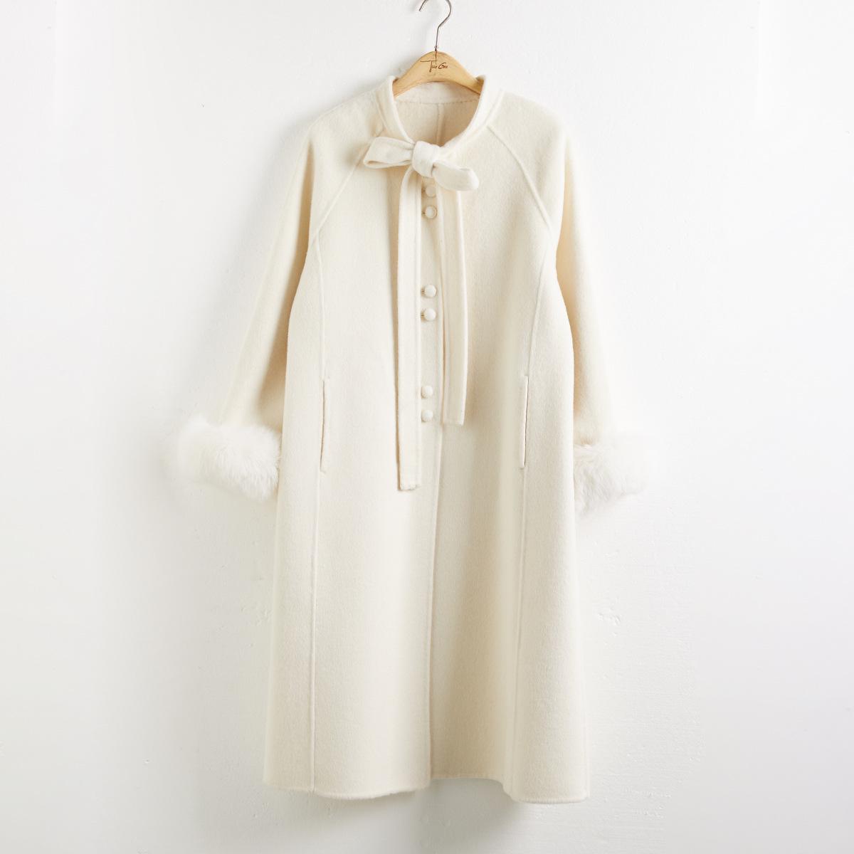 Пальто из шерсти французской наследницы «Лунный свет» с меховым воротником и бантом - Женское осенне-зимнее длинное пальто Medium белый
