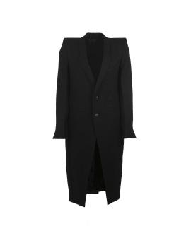 Черное пальто от Rick Owens, выполненное из натуральной шерсти, со структурированными плечами, остроконечными лацканами, длинными рукавами, нагрудным карманом, манжетами на пуговицах, боковыми карманами, разрезом сзади на подоле и длиной до колена ; 100% Шерсть