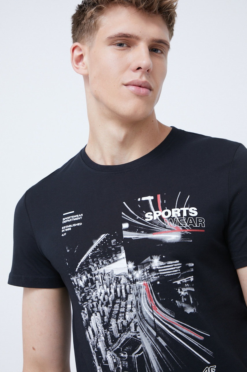 Тениска от колекция 4F. Моделът е направен от тънка и еластична материя.- Кройка: стандартна.- Овално деколте.- Щампа.- Дължина: 75 cm.- Ширина под мишниците: 51 cm.- Мерките се отнасят за размер: M.