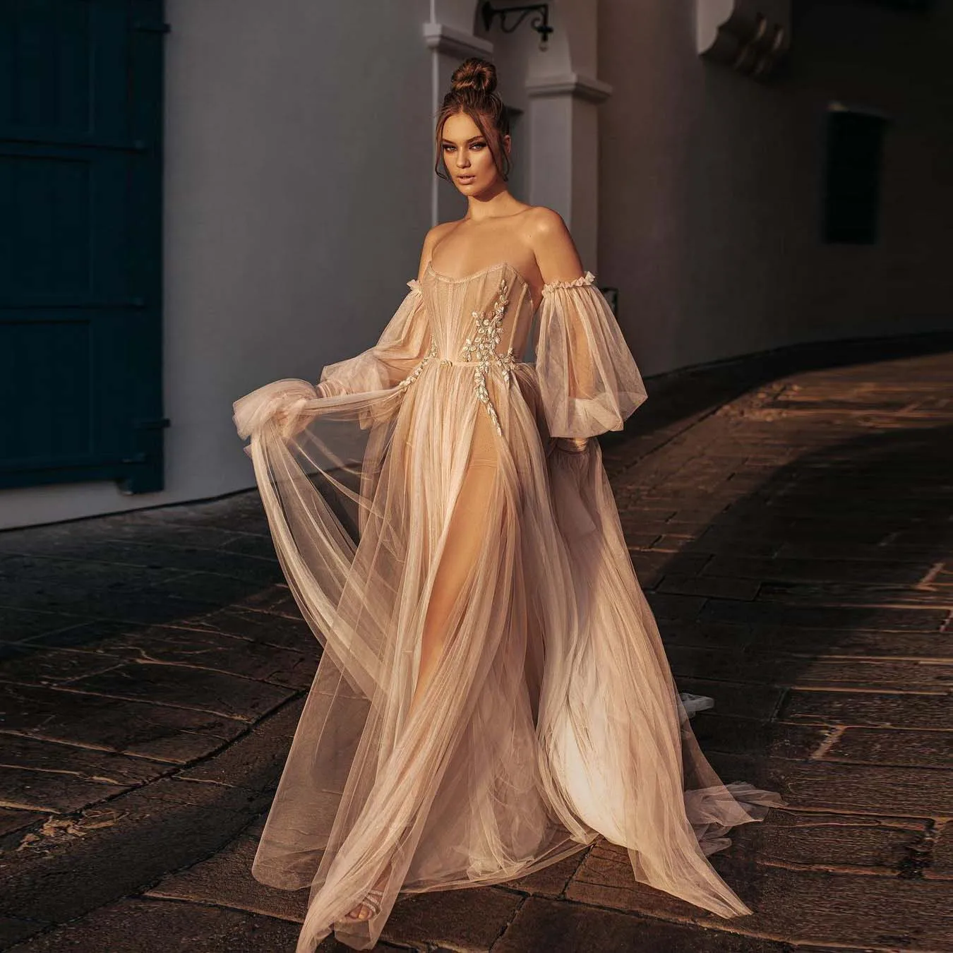 Модное сексуальное женское платье цвета шампанского без бретелек, прозрачное Тюлевое платье в пол со шлейфом и аппликацией, вечернее плать...