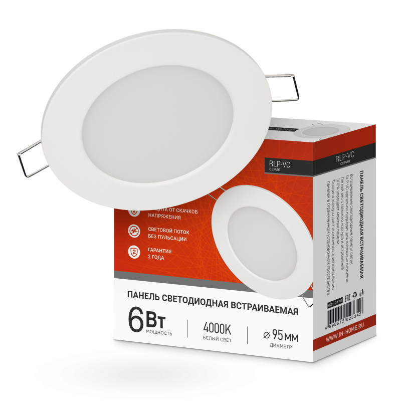 Панель светодиодная IN HOME 4690612023342 встраиваемая круглая RLP-VC 6Вт 4000К IP40 420лм 230В 95мм, белая, 4690612023342