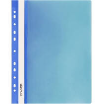 Папка-скоросшиватель формата А4 изготовлена из полипропилена, имеет прозрачный верхний лист. Снабжена боковой перфорацией для разных видов скоросшивателей. На лицевой стороне расположен карман с пластиковой полосой белого цвета, на которой можно указать содержание.
