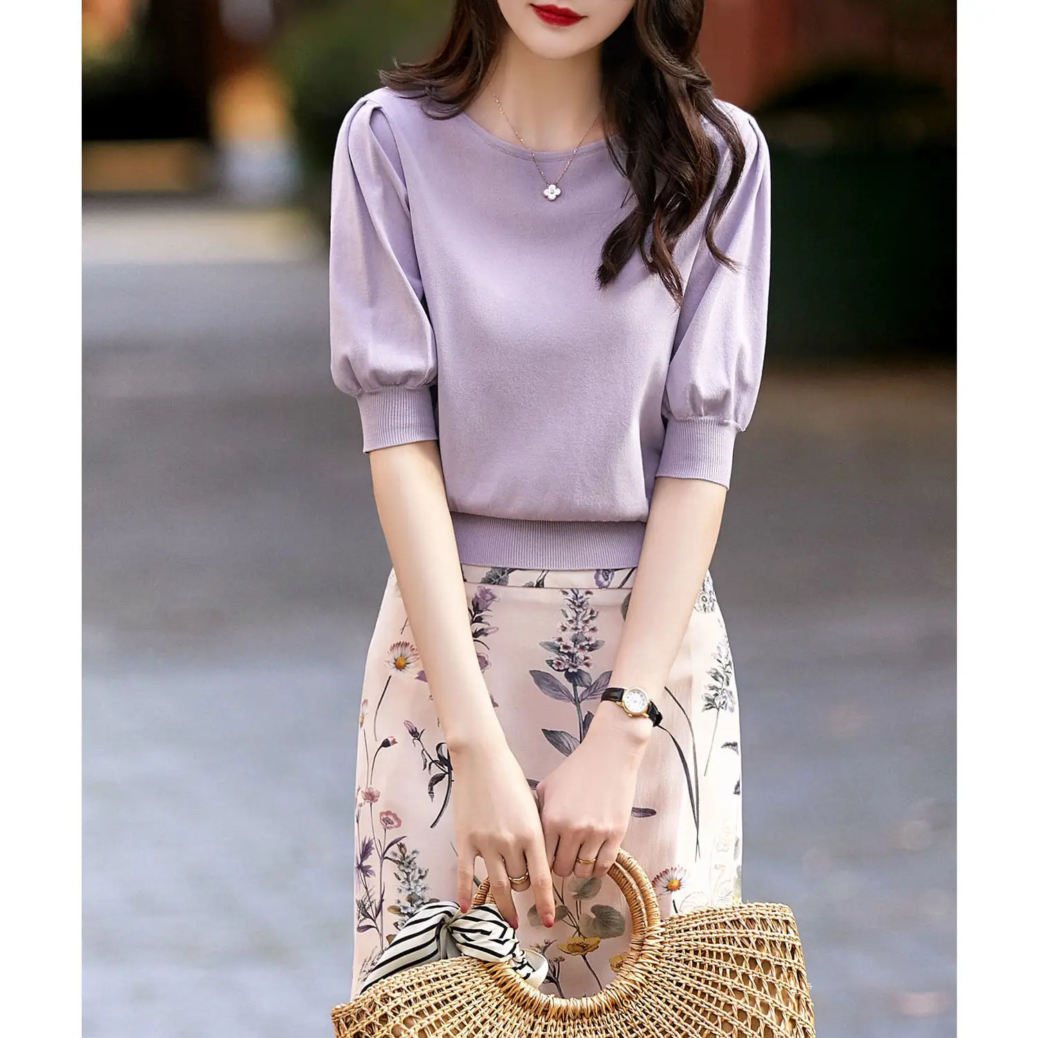 Cool and practical wear 5-point Lantern Sleeve ice silk knitted T-shirt women's 2021 spring and summer round neck thin top