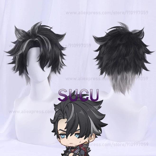 Парик для косплея Genshin Impact волнистый, парик для косплея Wriothesley, 28 см, термостойкие синтетические волосы из аниме серого и черного цвета