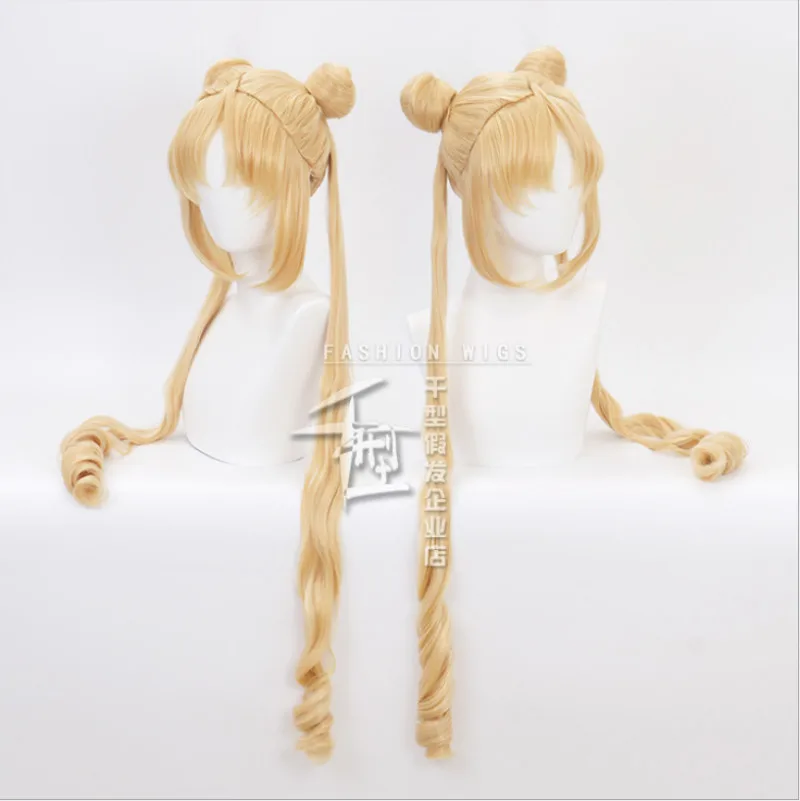 Парик для косплея Tsukino Usagi, термостойкие синтетические длинные вьющиеся светлые двойные хвосты + шапочка для парика