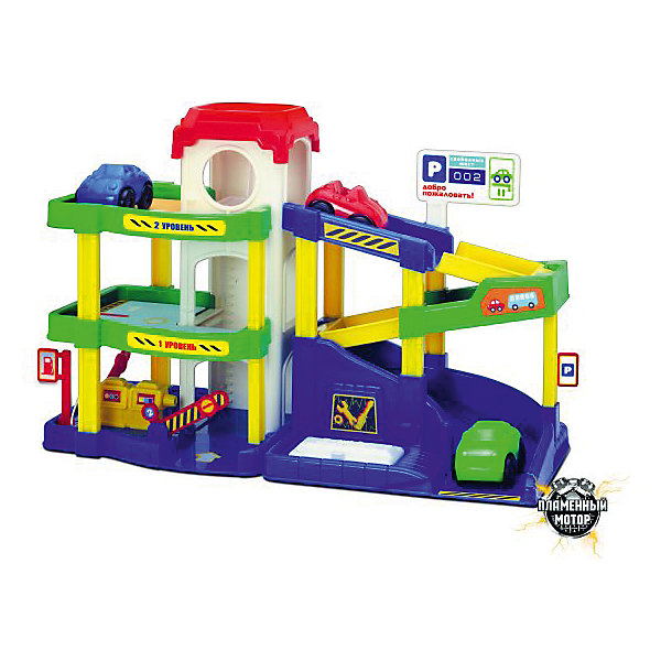 Паркинг «Автогородок» Пламенный мотор — 3-уровневая парковка, на которой имеется механический подъемник для поднятия машинок на верхний уровень. Внизу расположены заправка и автосервис. Въезд и выезд с парковки регулируются. Игрушка выполнена из качественного пластика.