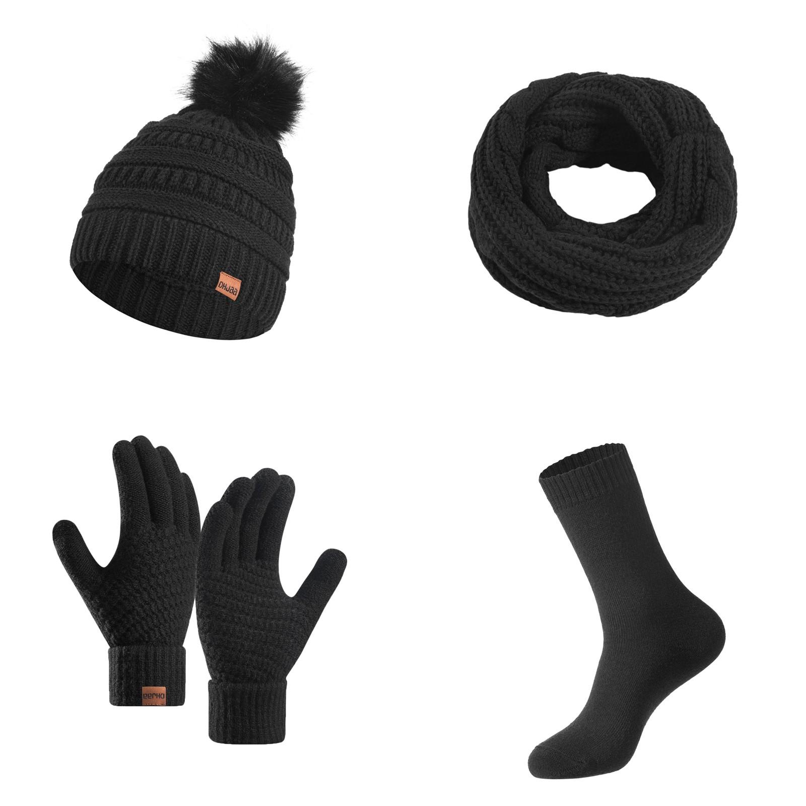 Парная теплая шерстяная шапка, вязаная плюс бархатная утолщенная взрослая шапка, шарф, перчатки, носки, комплект из четырех предметов One Size чёрный
