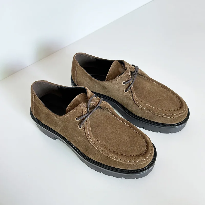 Новинка 2025, женские туфли дерби из натуральной кожи, коричневые замшевые универсальные лоферы с круглым носком на шнуровке и толстой подошве для женщин