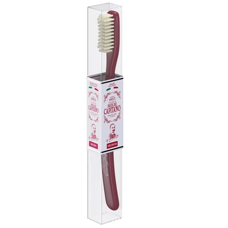 Эта зубная щетка является воспроизведением первого оригинального дизайна щетки Pasta del Capitano. Щетка понравится всем, кто любит винтаж и действительно хочет пользоваться премиальными средствами по уходу за полостью рта. Ручка специальной формы удобно лежит в руке, а скругленные щетинки средней жесткости деликатно очищают зубы и массируют дёсны. Цвет: красный