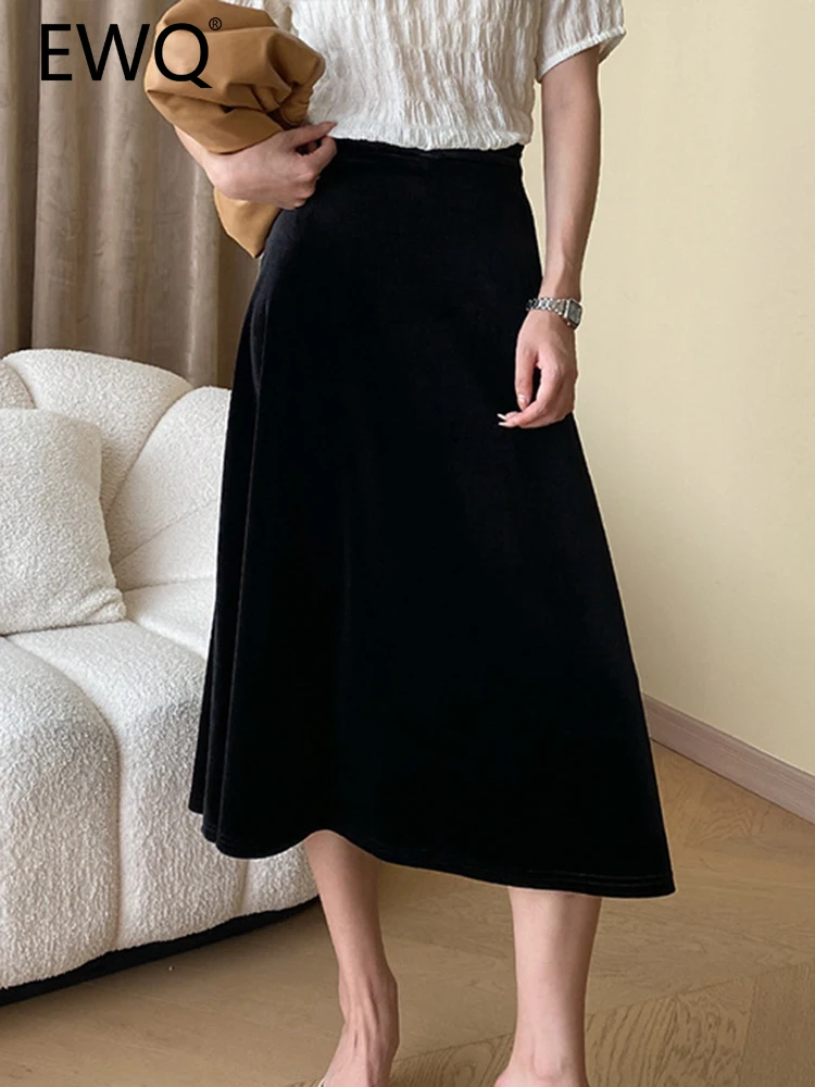 EWQ Elegant Velvet High Waist Skirts For Women Black A-line Mid-length Office Lady Female Clothing 2023 Autumn New 26D5420