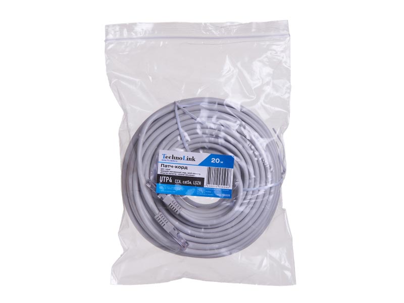 Патч-корд UTP кат.5e, 20м, RJ45-RJ45, серый, LSZH, Technolink (TC.CCA.UTP.5e-20m-2-lszh / 58009)