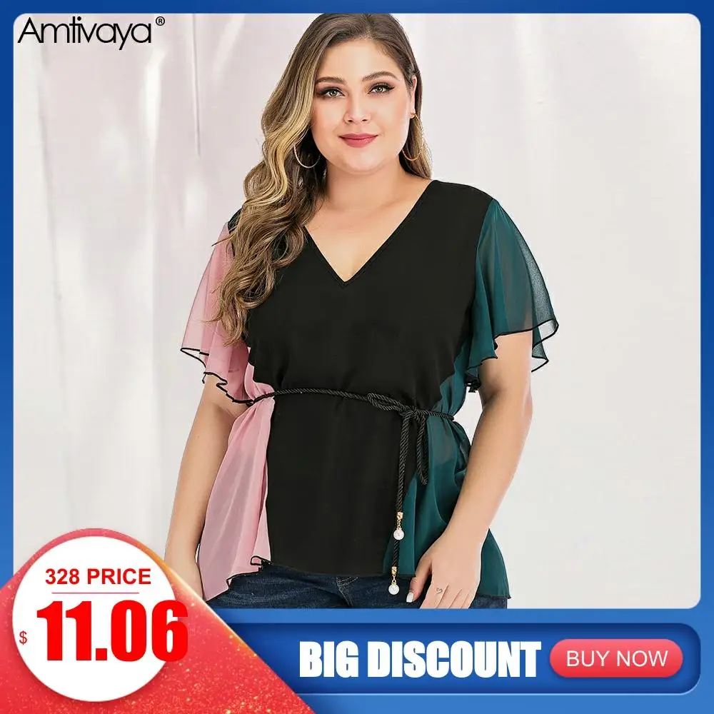 Amtivzya Women's Chiffon Blouses Plus Size Fashion Ruffles Short Sleeve V Neck Hit Color Patchwork Tops Summer 2020 slim Sash
