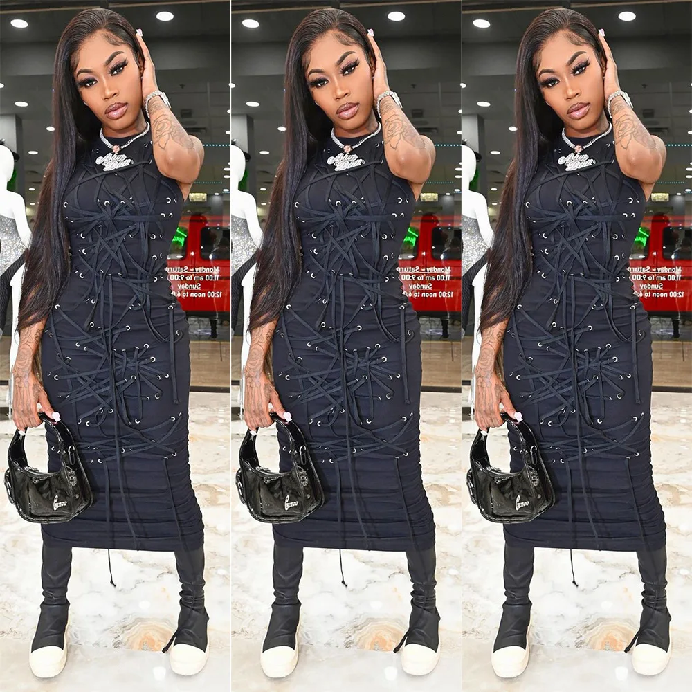 Платье женское средней длины, однотонное эластичное облегающее платье без рукавов, с воротником-стойкой, на завязках, с молнией сзади, модна...