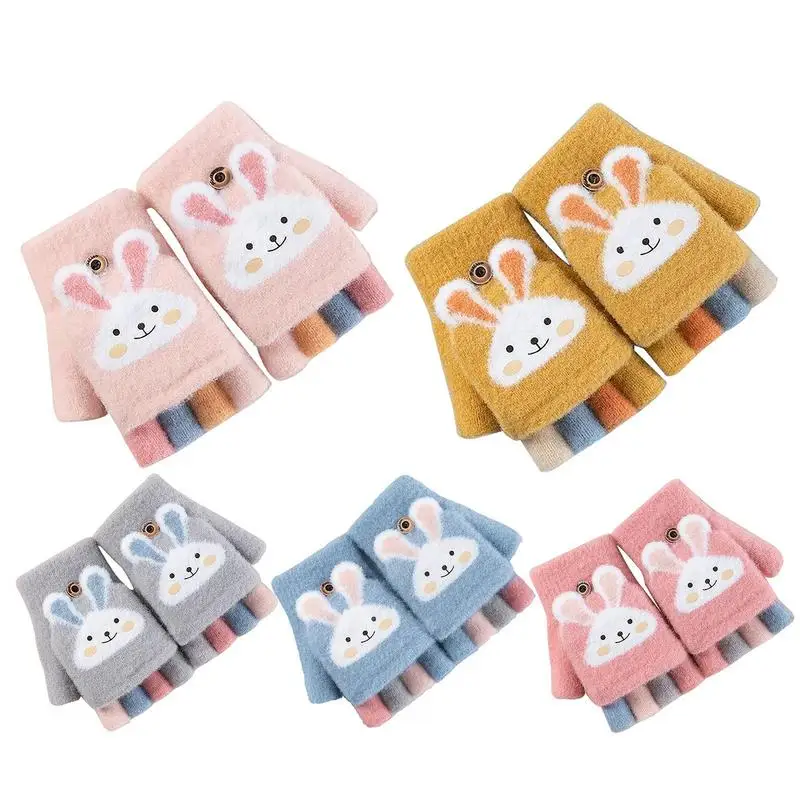Перчатки без пальцев для девочек, милые плюшевые перчатки без пальцев, зимние перчатки для детей, жаккардовые перчатки с изображением кролика для маленьких девочек и мальчиков