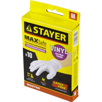 Перчатки виниловые, устойчивы к слабым растворам кислот и щелочей, пар в упаковке: 5, M, гипоаллергенные ,экстратонкие, STAYER MASTER (11208-M), Нет данных, 0