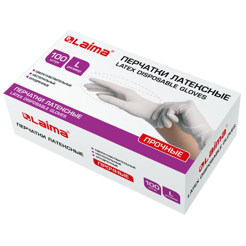Перчатки одноразовые латексные, пар в упаковке: 50, L, белый, LAIMA