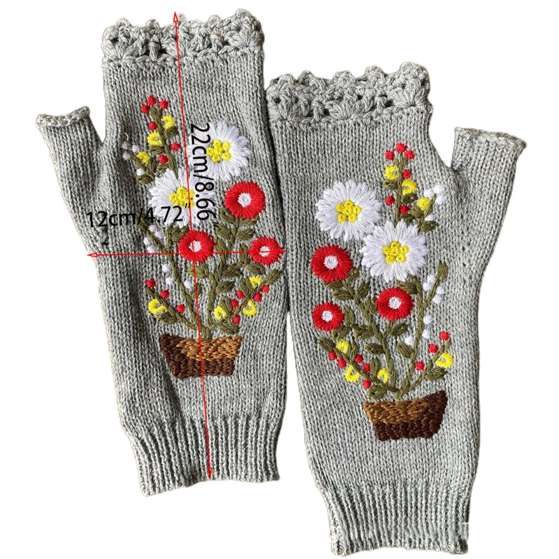 Перчатки с половиной пальца, перчатки без пальцев с цветочной вышивкой, вязаные зимние теплые перчатки