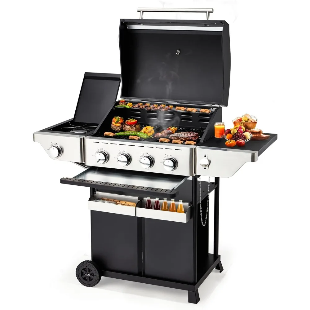 Печь для барбекю, 4 горелки для пропанового барбекю, с боковой горелкой, нержавеющая сталь 42000 BTU, с ящиком для хранения, печь для барбекю