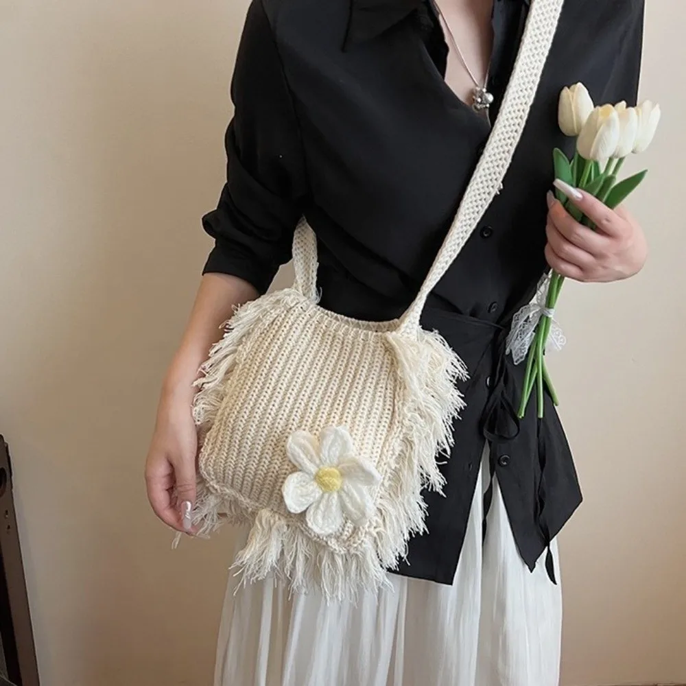 Durable Flower Knitted Shoulder Bag Korean Style Large Capacity Crochet Tote Bag Versatile Solid Color Woven Handbag Summer