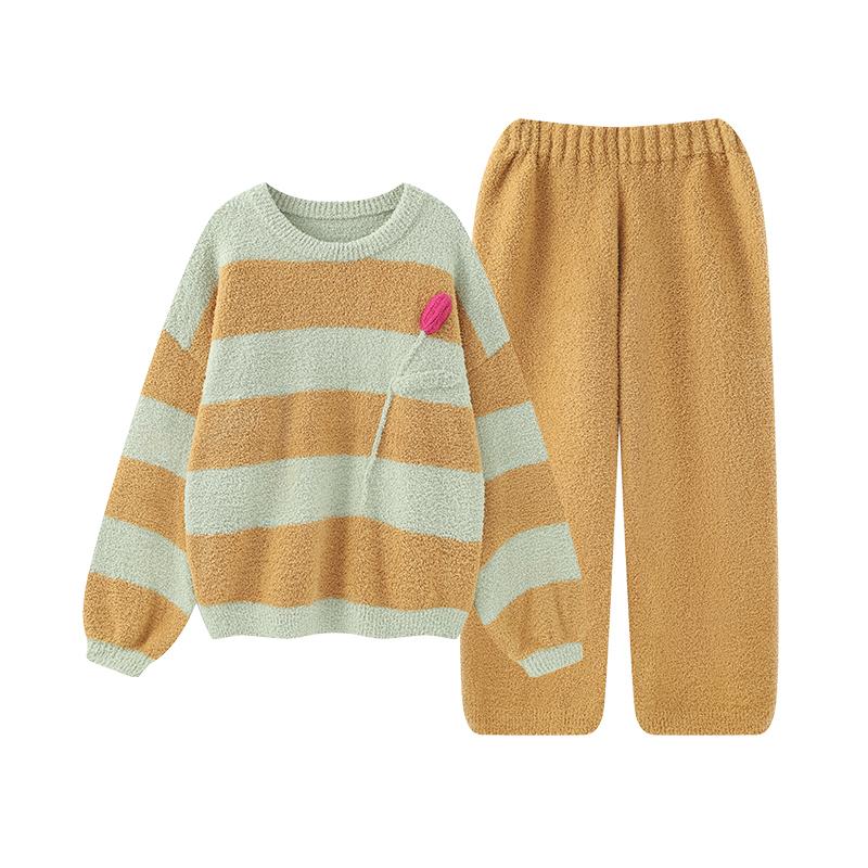 Пижама в зеленую полоску, женская осенне-зимняя домашняя одежда, утепленный верхний костюм из кораллового флиса, который можно носить на улице. One Size жёлтый