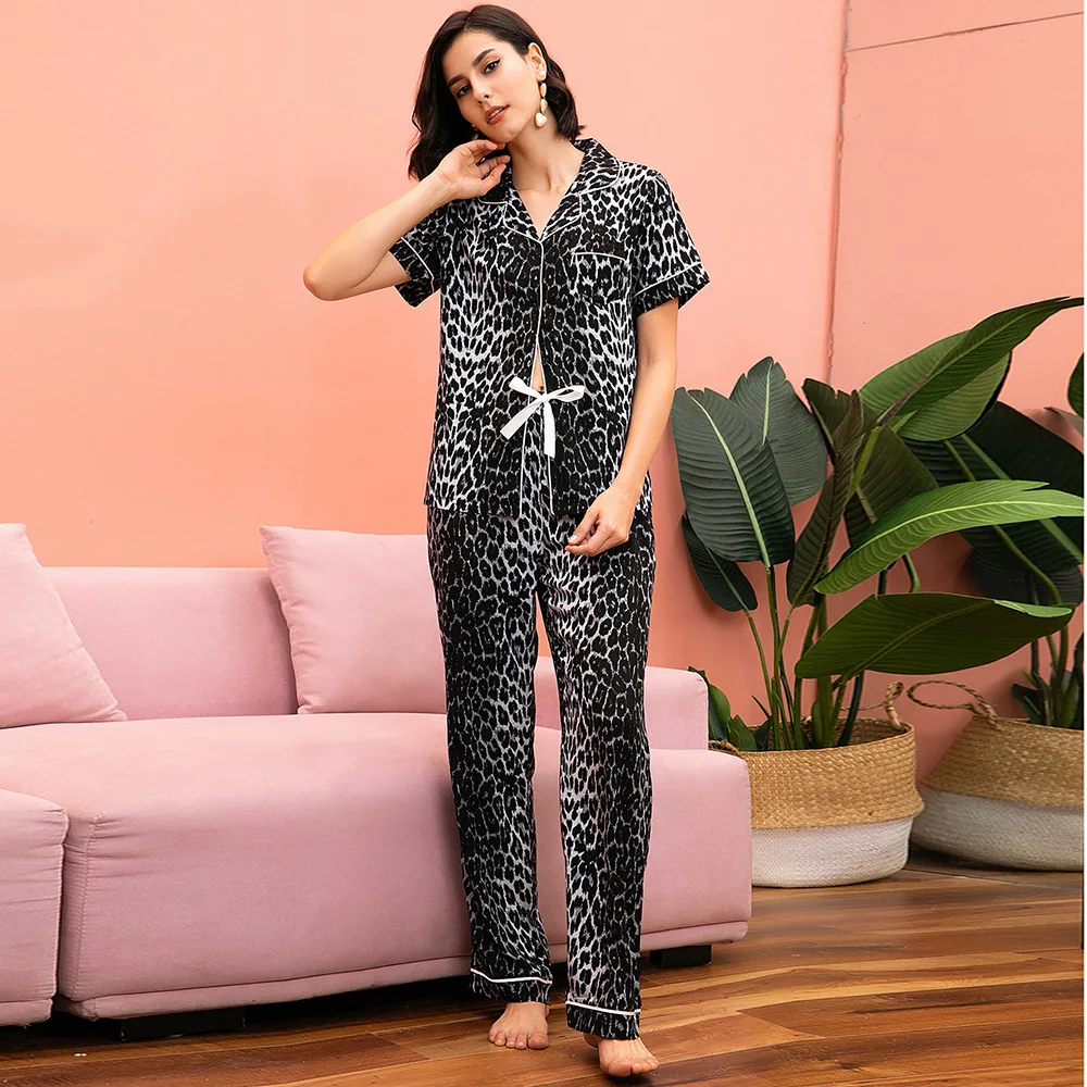 Пижама женская с леопардовым принтом, кардиган с коротким рукавом, топ, брюки, пижама, домашняя одежда, пикантная пижама из двух предметов