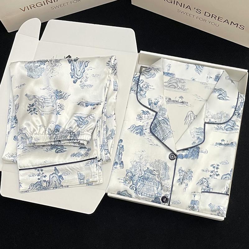 Пижама женская шелковая пижама с длинными рукавами пижамный костюм с цветочным принтом высококачественный ледяной шелк можно носить на улице домашняя одежда пижама XL