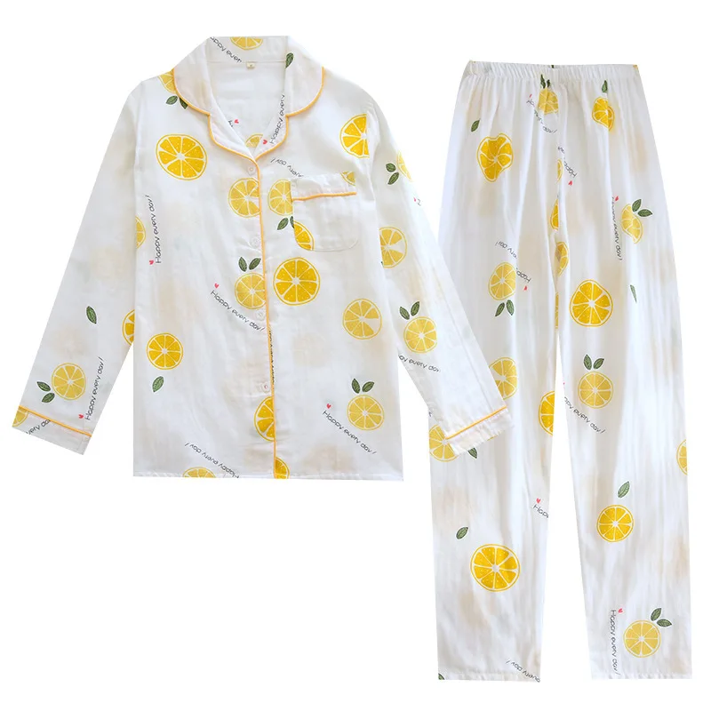 Пижама из чистого хлопка, женские весенне-осенние брюки с длинным рукавом, домашняя одежда, кардиган с лацканами, тонкий мультяшный лимонны...