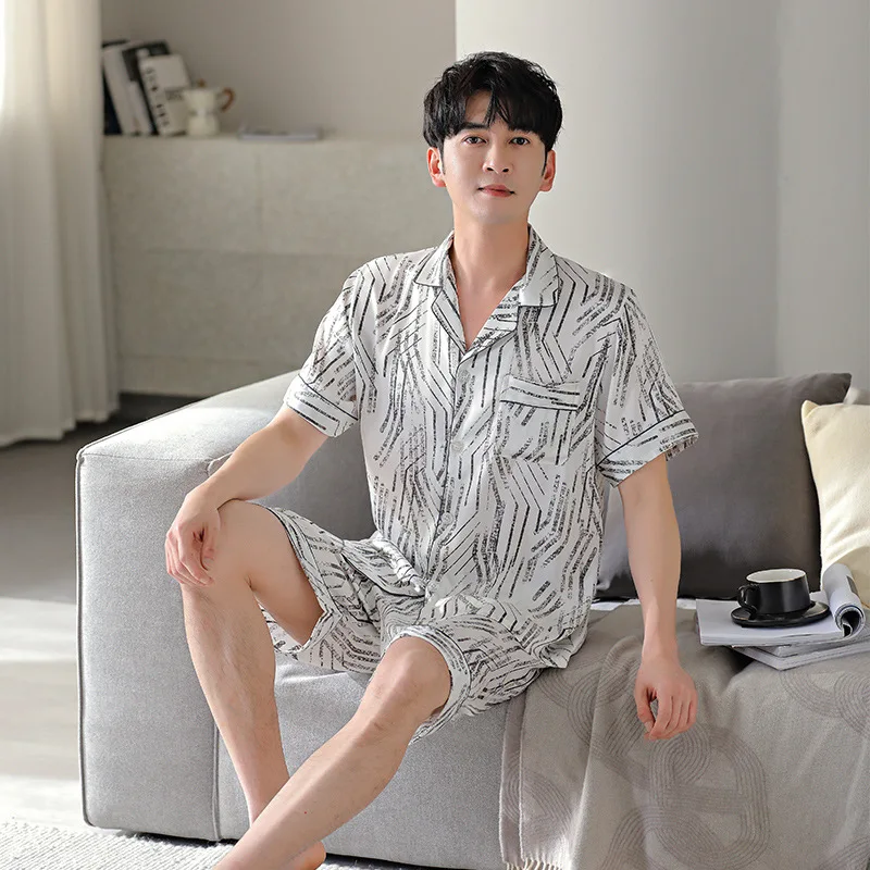 Пижамный комплект мужской в белую полоску, мягкая удобная атласная рубашка и шорты, Пижама